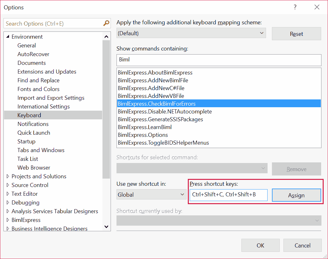 Select a Biml command, click in the Press shortcut keys box, click the keyboard shortcut combination of your choice, and click the Assign button. In this example, I have used Ctrl+Shift+C, Ctrl+Shift+B (I chose C then B for “Check Biml”):