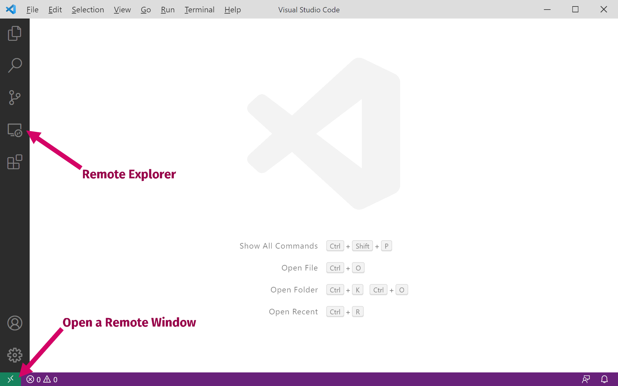 Once you have installed Visual Studio Code with the Remote - Containers extension, you will see a new Remote Explorer button on the menu, and a new green button on the status bar for working with remote windows: