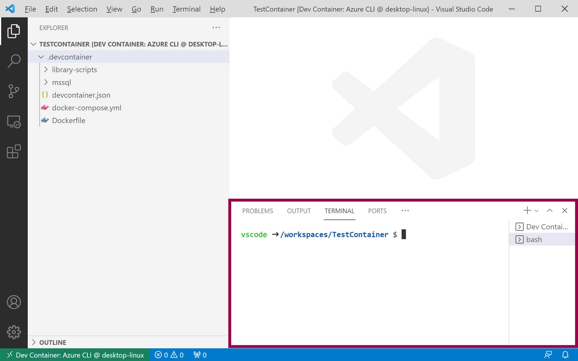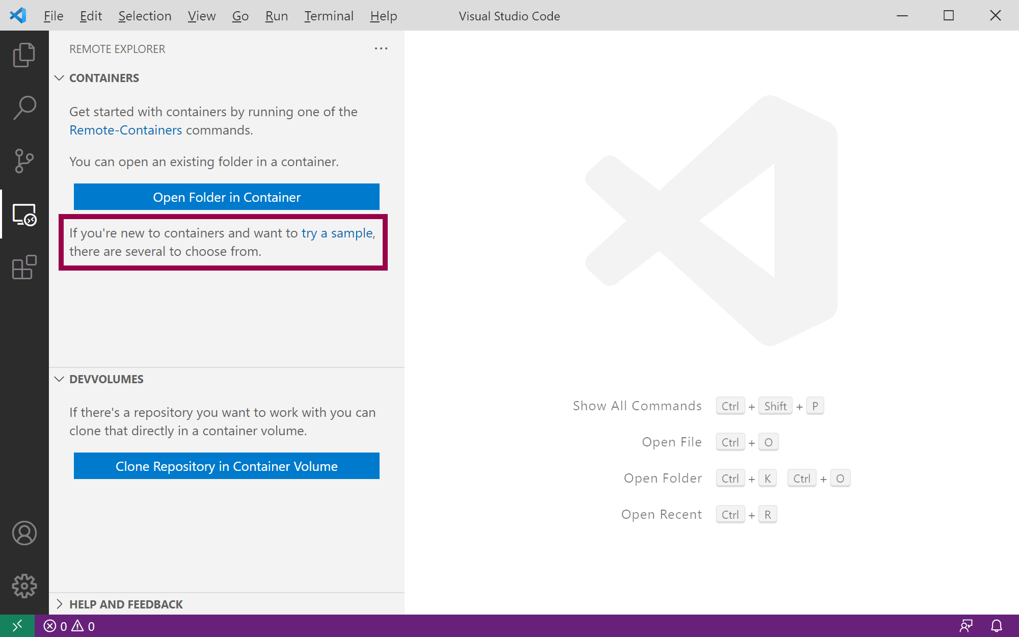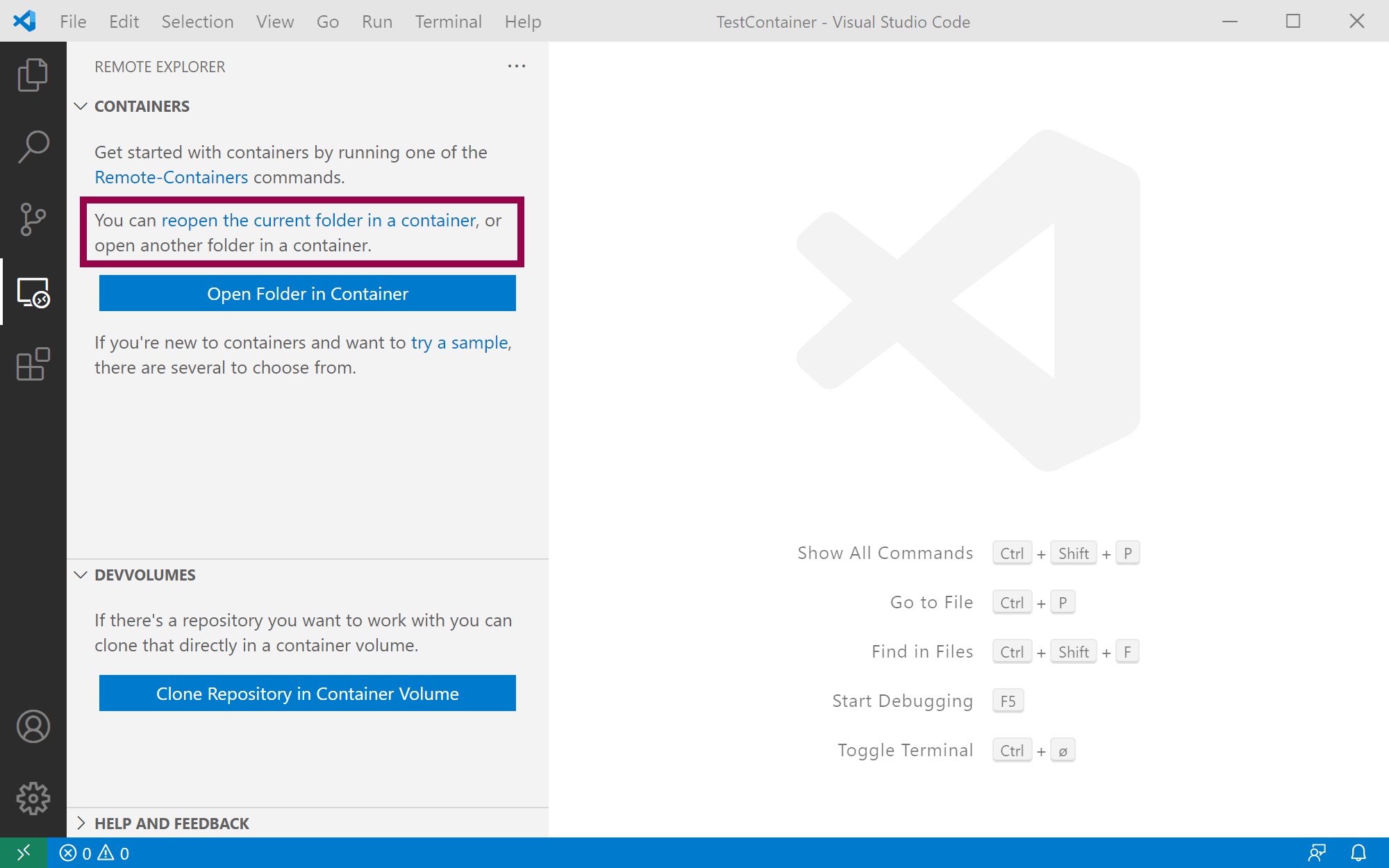 If you instead create and open a folder, the status bar will turn blue. It will also give you a new option to reopen the current folder in a container: