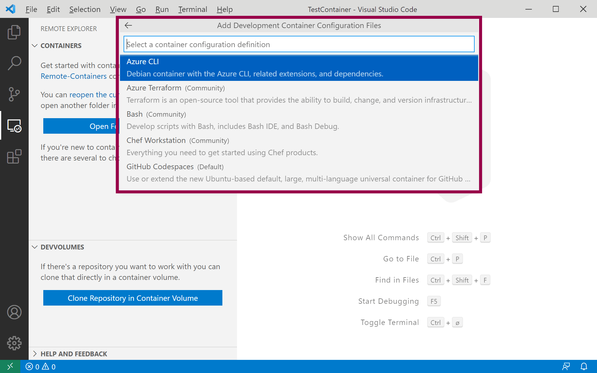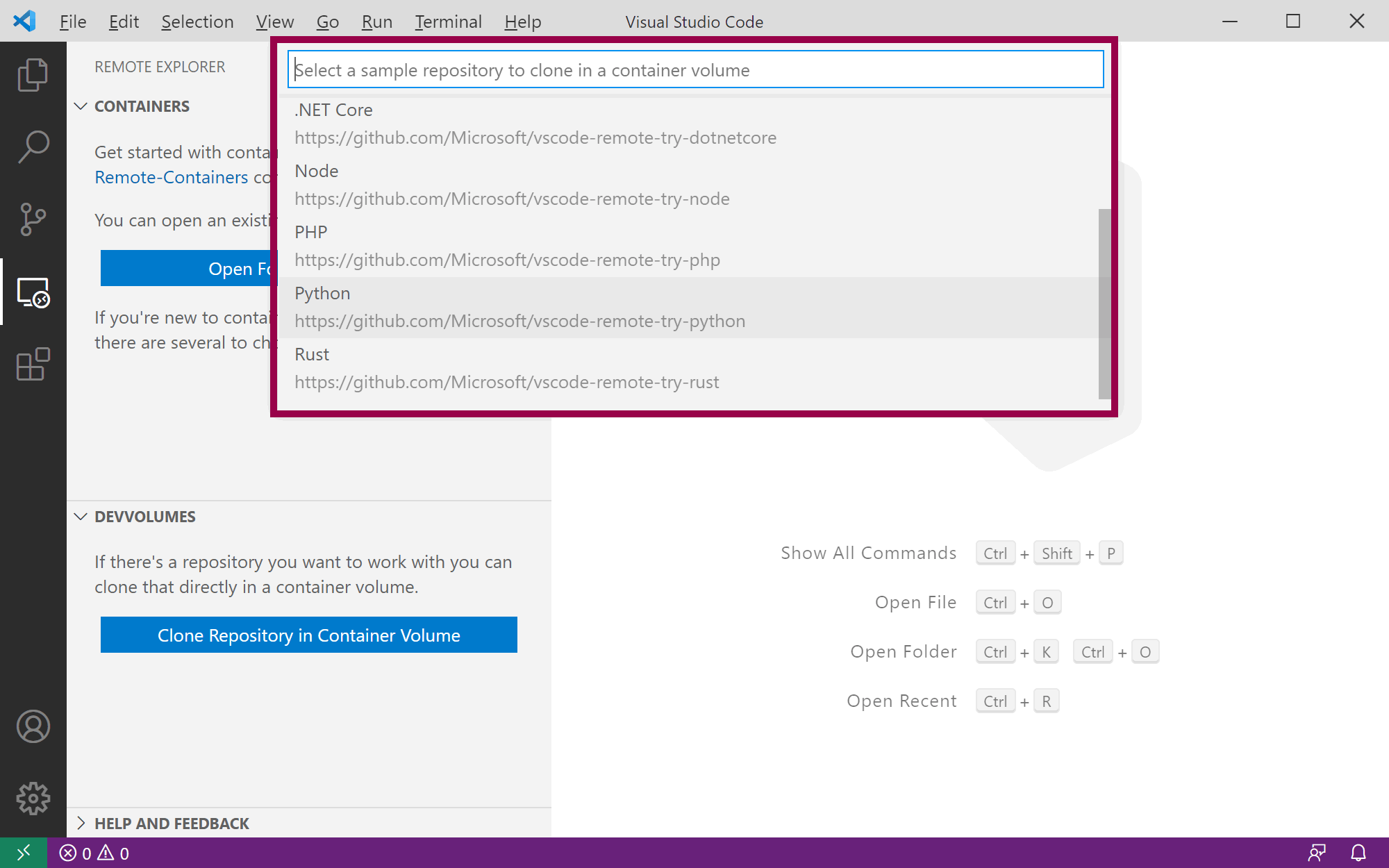 This opens the Command Palette where you can choose from a list of sample repositories to clone in a container volume, for example .NET Core or Python: