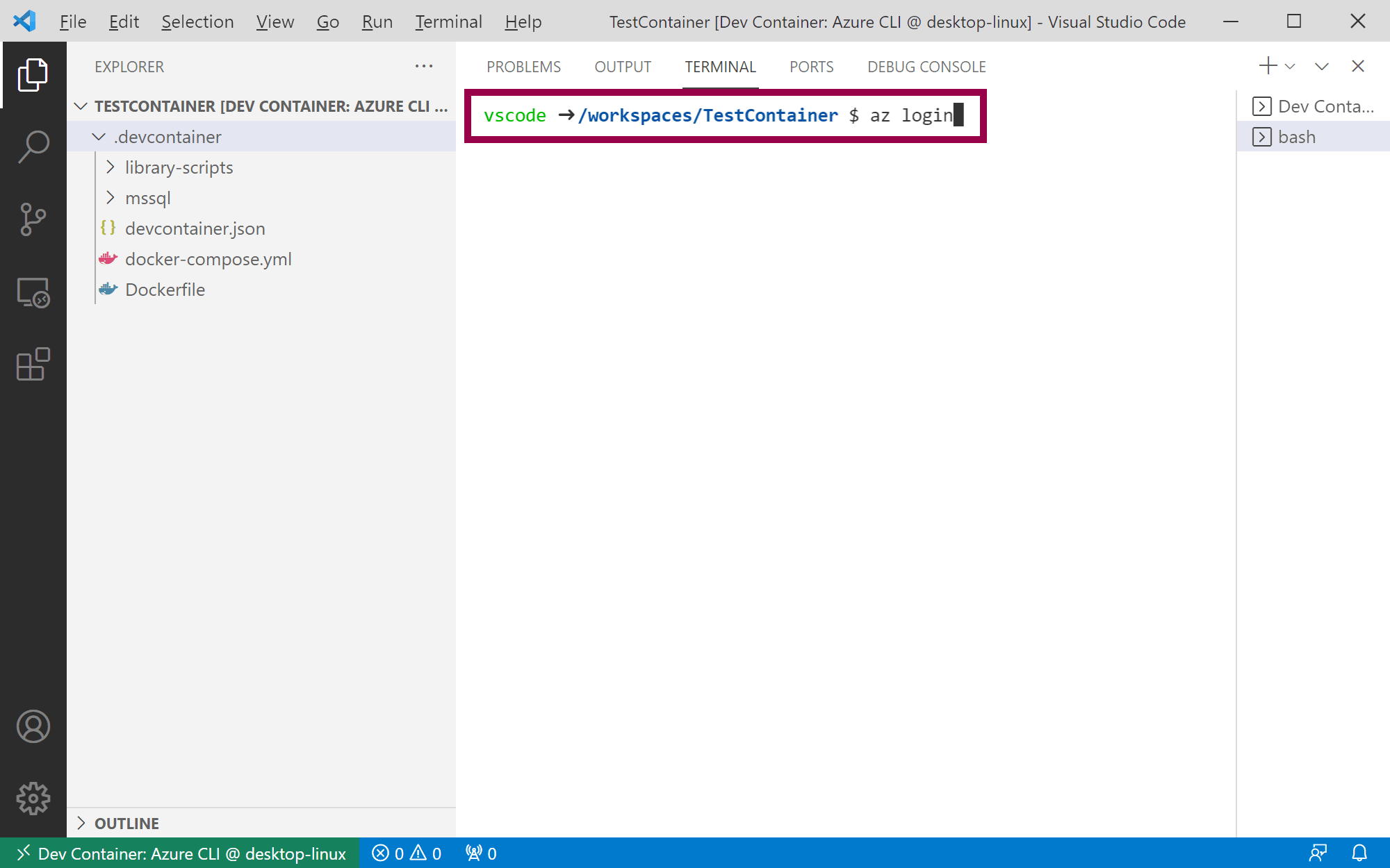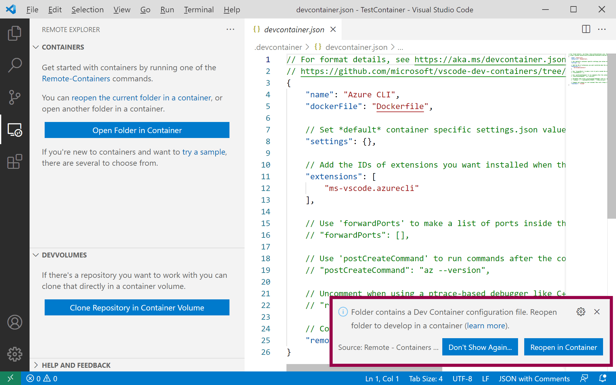 After clicking on Azure CLI, a devcontainer.json file is added to the project. Since your folder now contains a Dev Container configuration file, you are prompted to reopen in container: