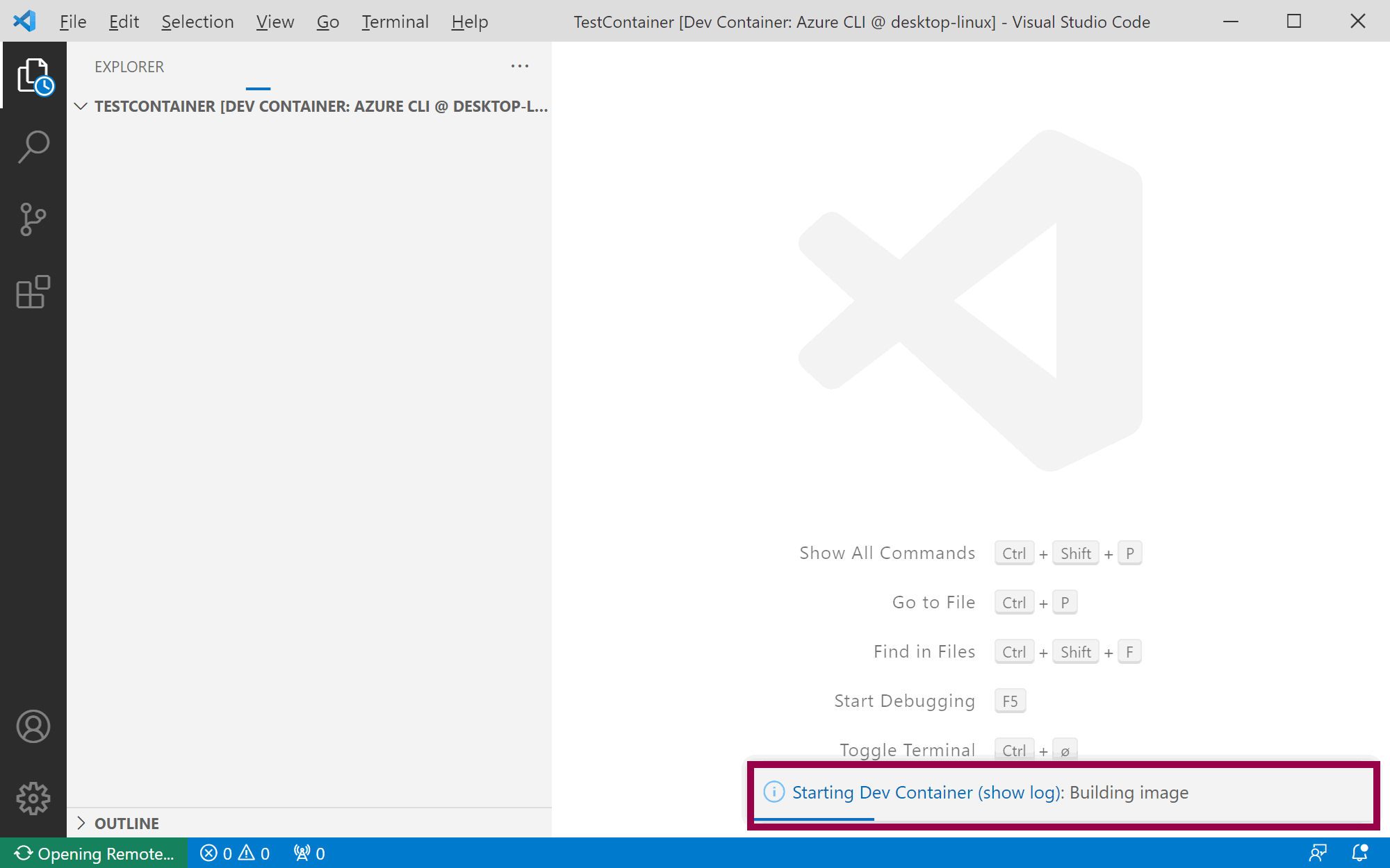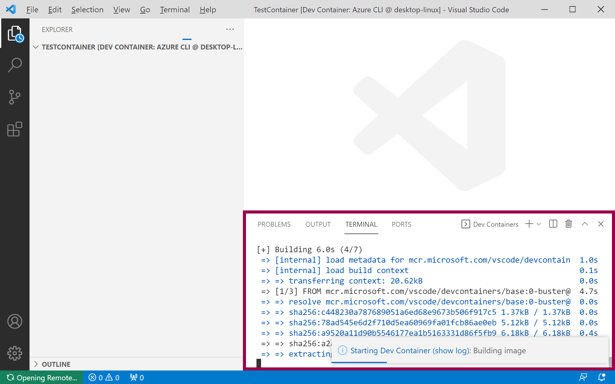 When you click reopen in container, Visual Studio Code starts building the dev container. You can click on show log to follow the progress: