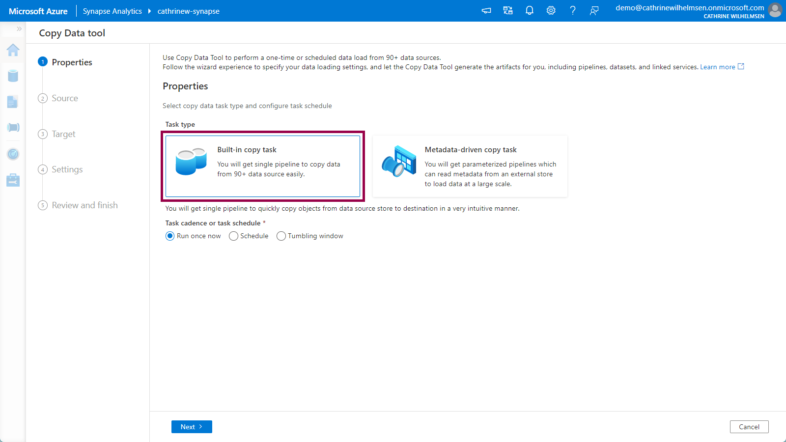 On the Properties page, choose the built-in copy task. This will create a single pipeline. (The other option, metadata-driven copy task, was released in July 2021. It will create a full, dynamic, metadata-driven framework.) Keep the default run once now option: