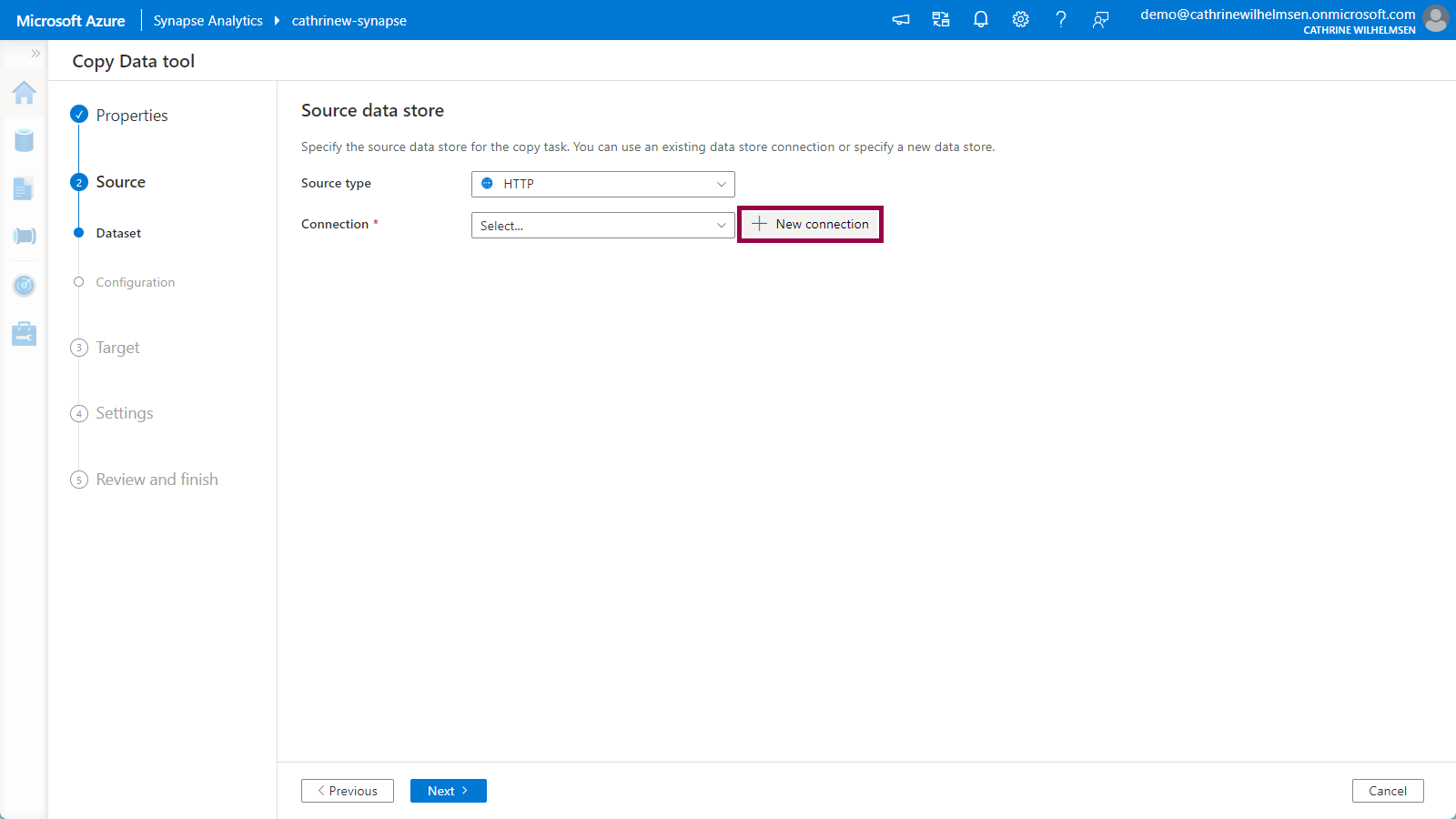 On the Source Dataset page, choose HTTP from the source type dropdown, then click new connection: