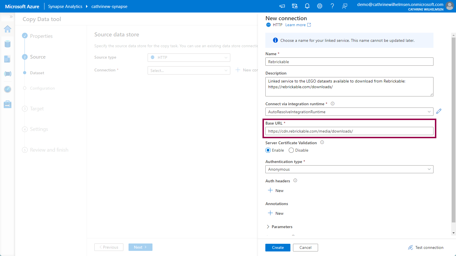 Give the linked service a name and description, and use the base URL https://cdn.rebrickable.com/media/downloads/. (You can find this URL by inspecting the links on rebrickable.com/downloads. Keep the last slash.) Change authentication type to anonymous. Click create: