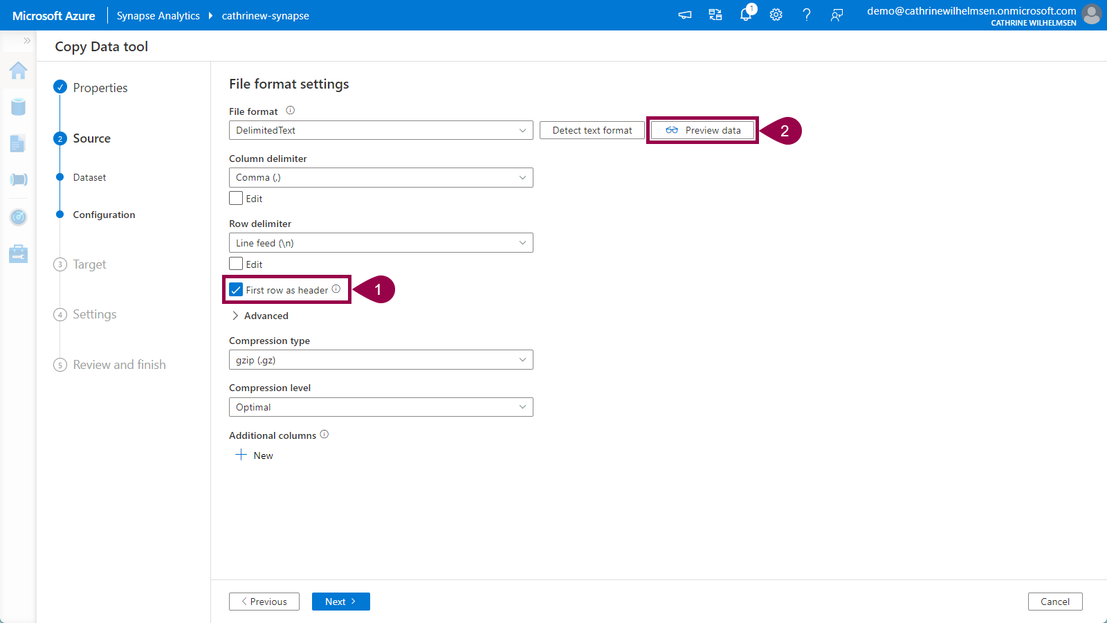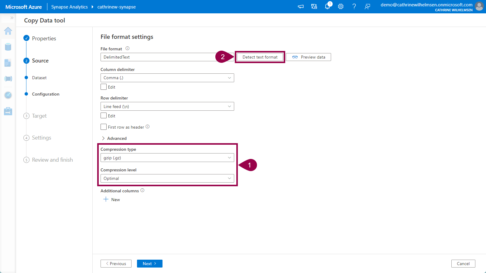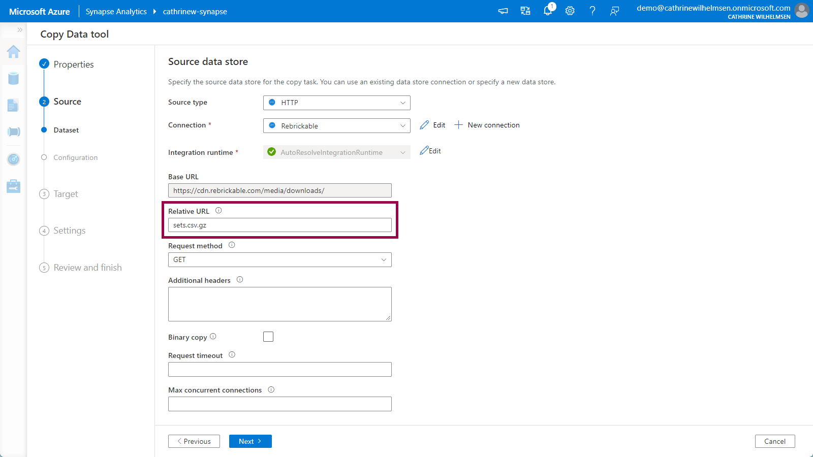 Since we specified the base URL in the linked service, we only have to specify the file name sets.csv.gz in the relative URL. Keep the other default options. Click next: