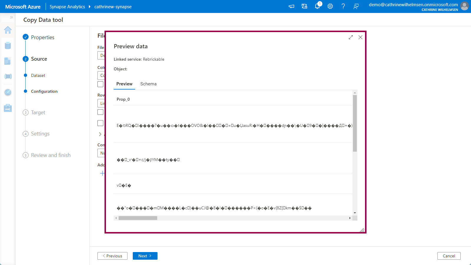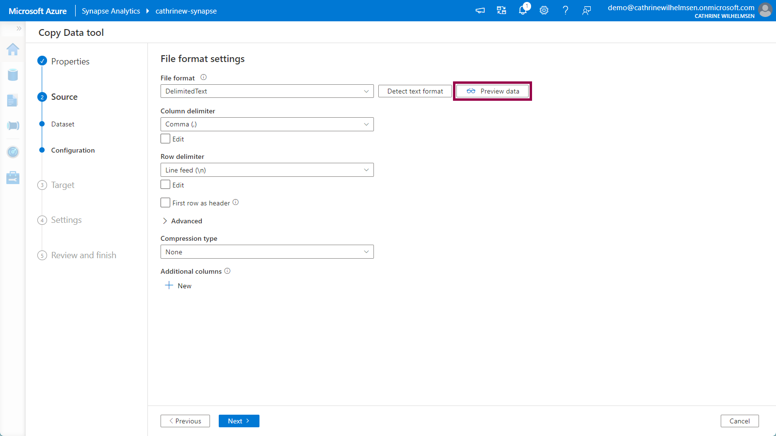 On the Source Configuration page, we have to specify the file format settings. If we immediately click on preview data, nothing really makes sense…