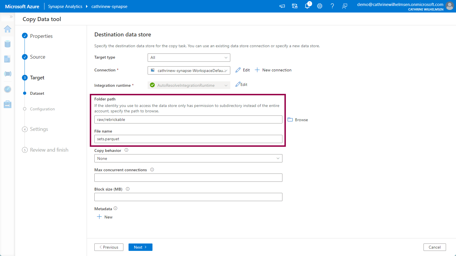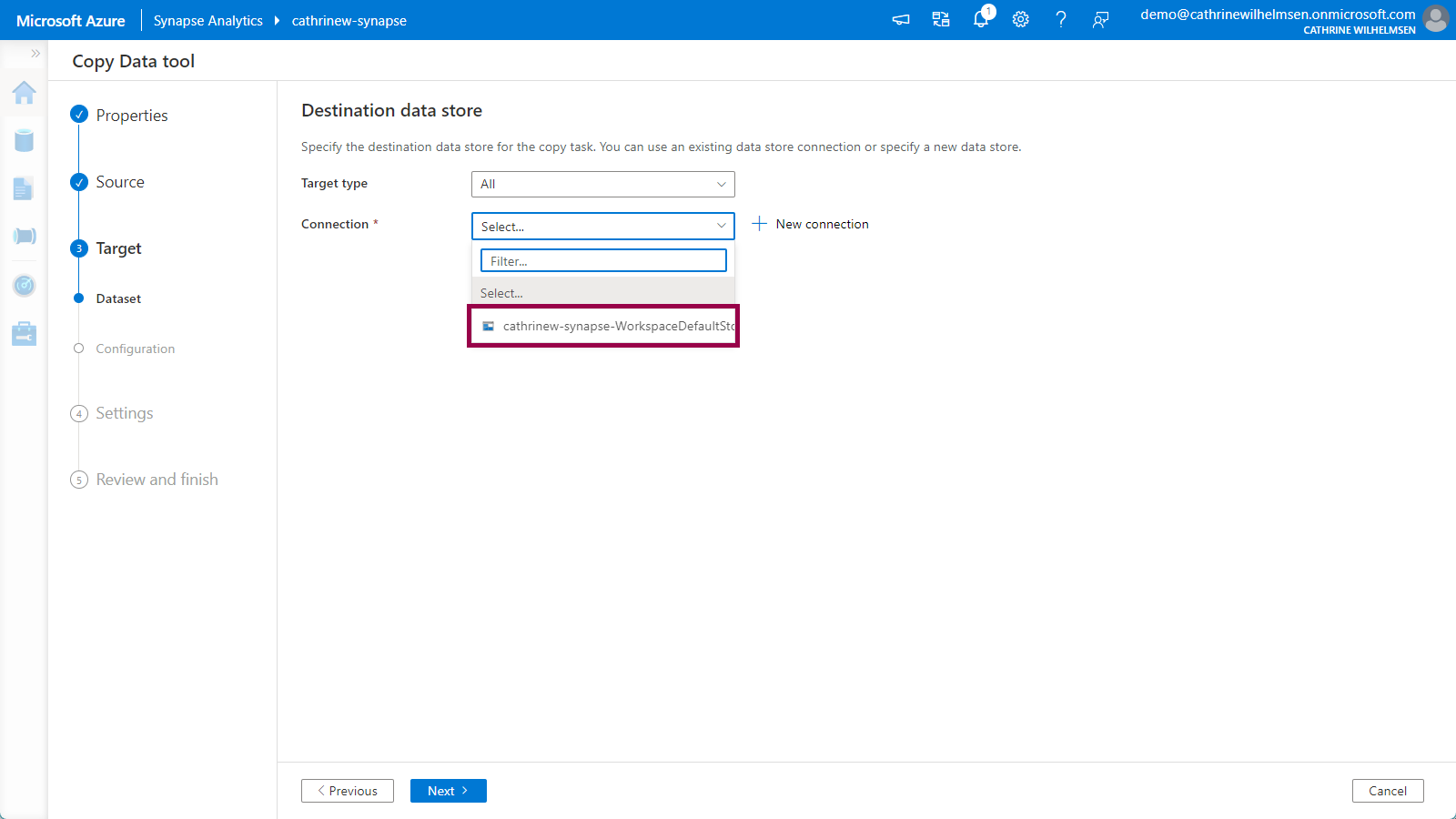 On the Target / Destination Dataset page, choose your WorkspaceDefaultStorage connection:
