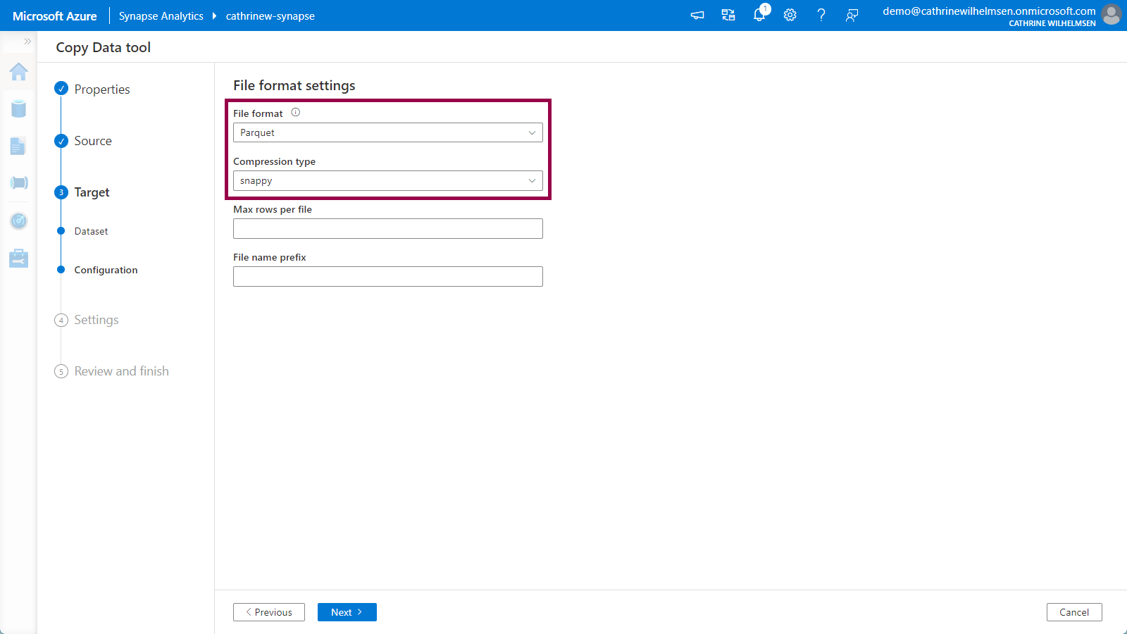 Verify that the file format is automatically set to Parquet with the snappy compression after specifying .parquet as the file name in the previous step: