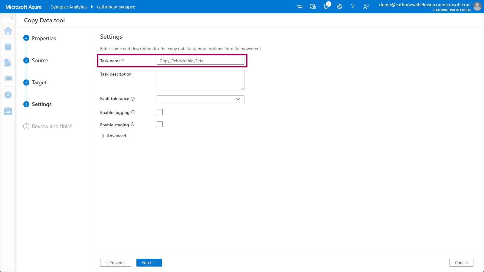 On the Settings page, give the task a better name, for example Copy_Rebrickable_Sets: