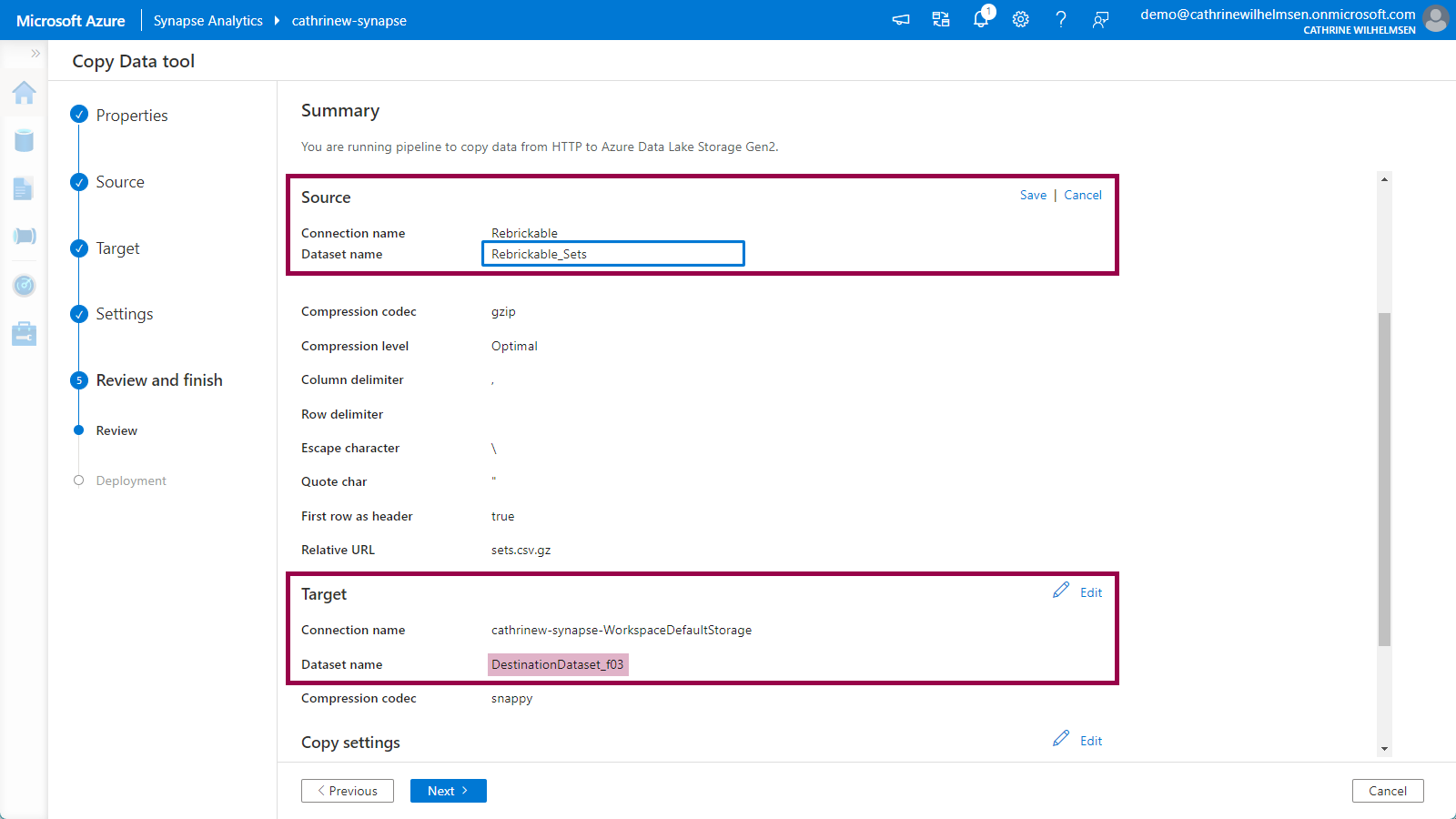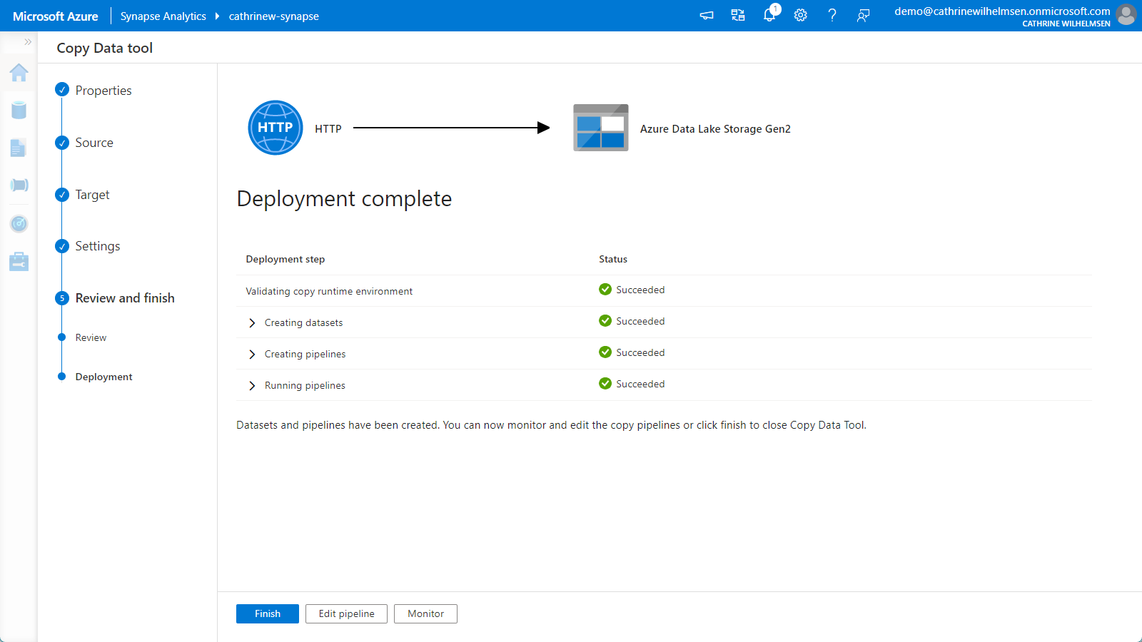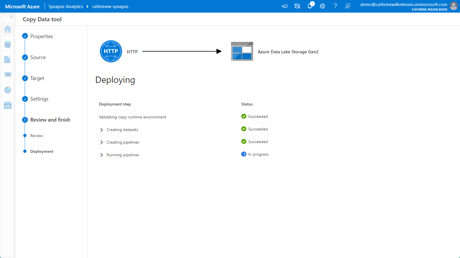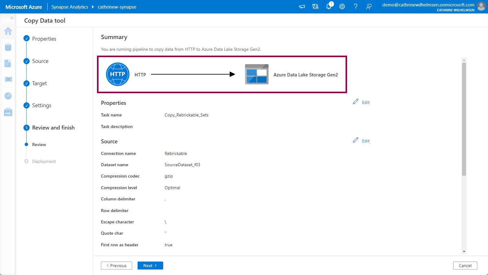 On the Review page, you will see a pretty graphic illustrating that you are copying data from an HTTP source to an Azure Data Lake Storage Gen2 target: