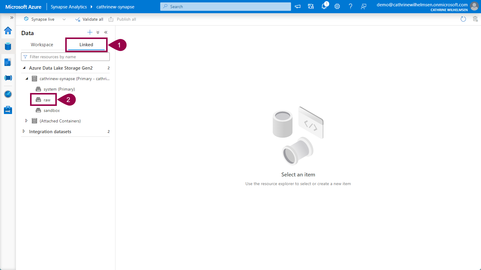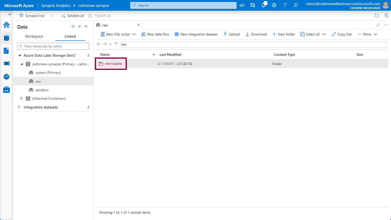 In the Data hub, click on linked, and then navigate down to the new raw container inside your primary storage account: