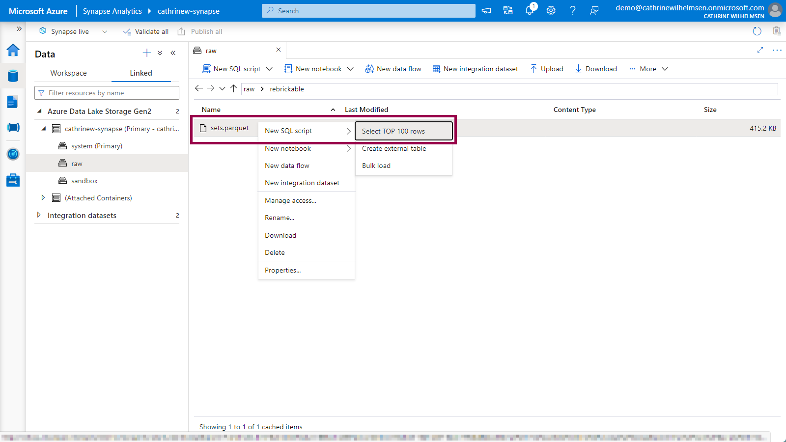 Right-click on the new sets.parquet file, choose new SQL script and click on select top 100 rows: