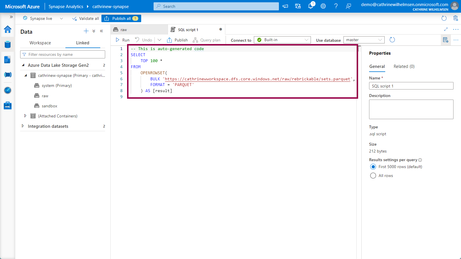 This will open a new Serverless SQL tab with the OPENROWSET code auto-generated, so you don’t have to remember the syntax yourself: