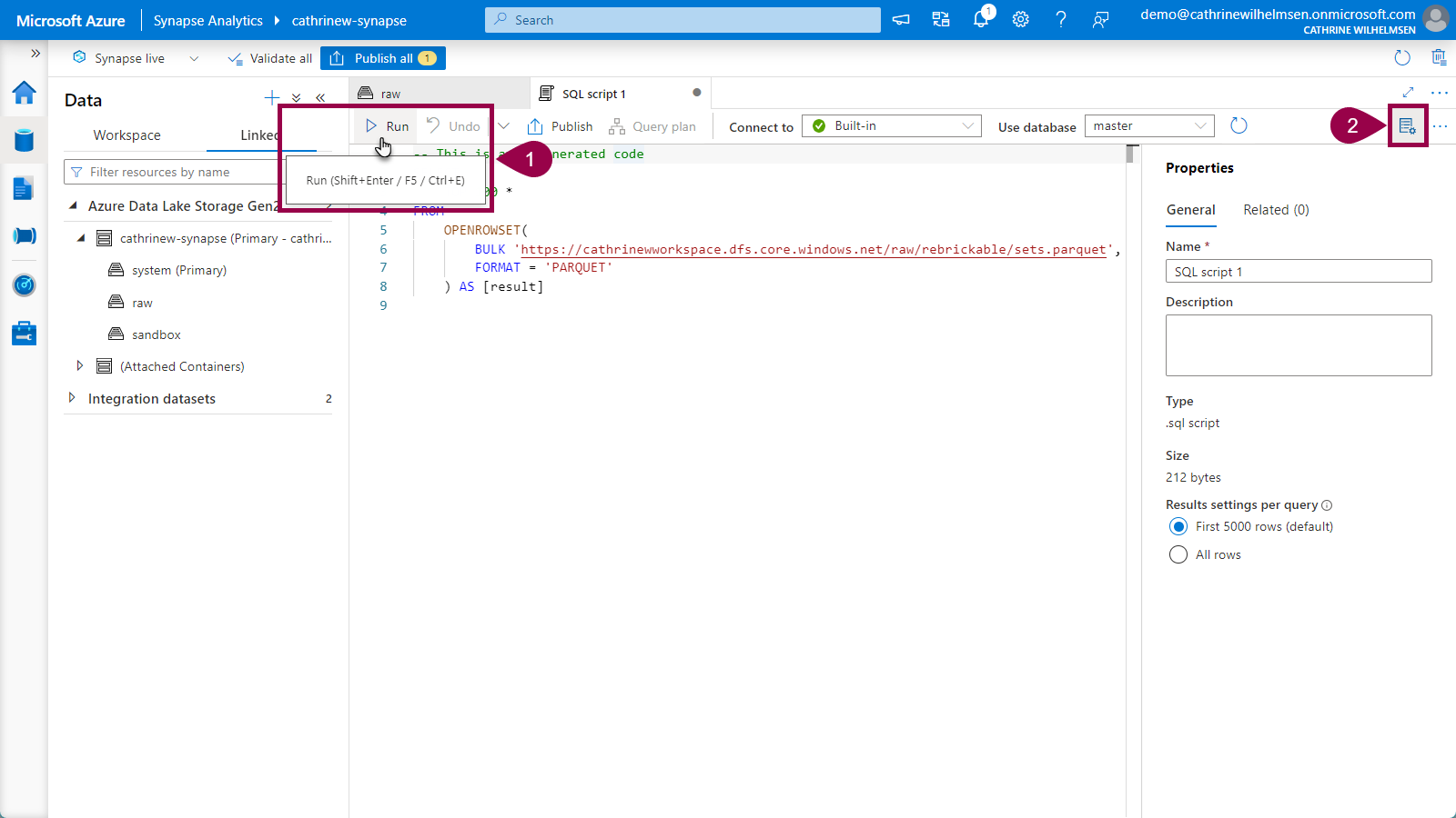 Execute the query by clicking on run, or by pressing Shift+Enter or F5. You can also click on the properties button in the top right corner to close the properties pane: