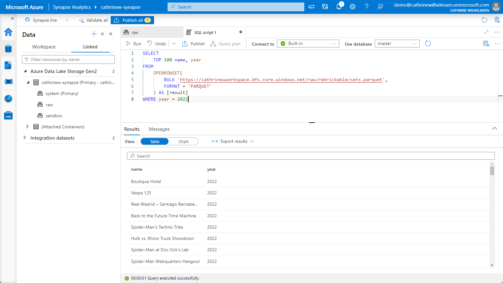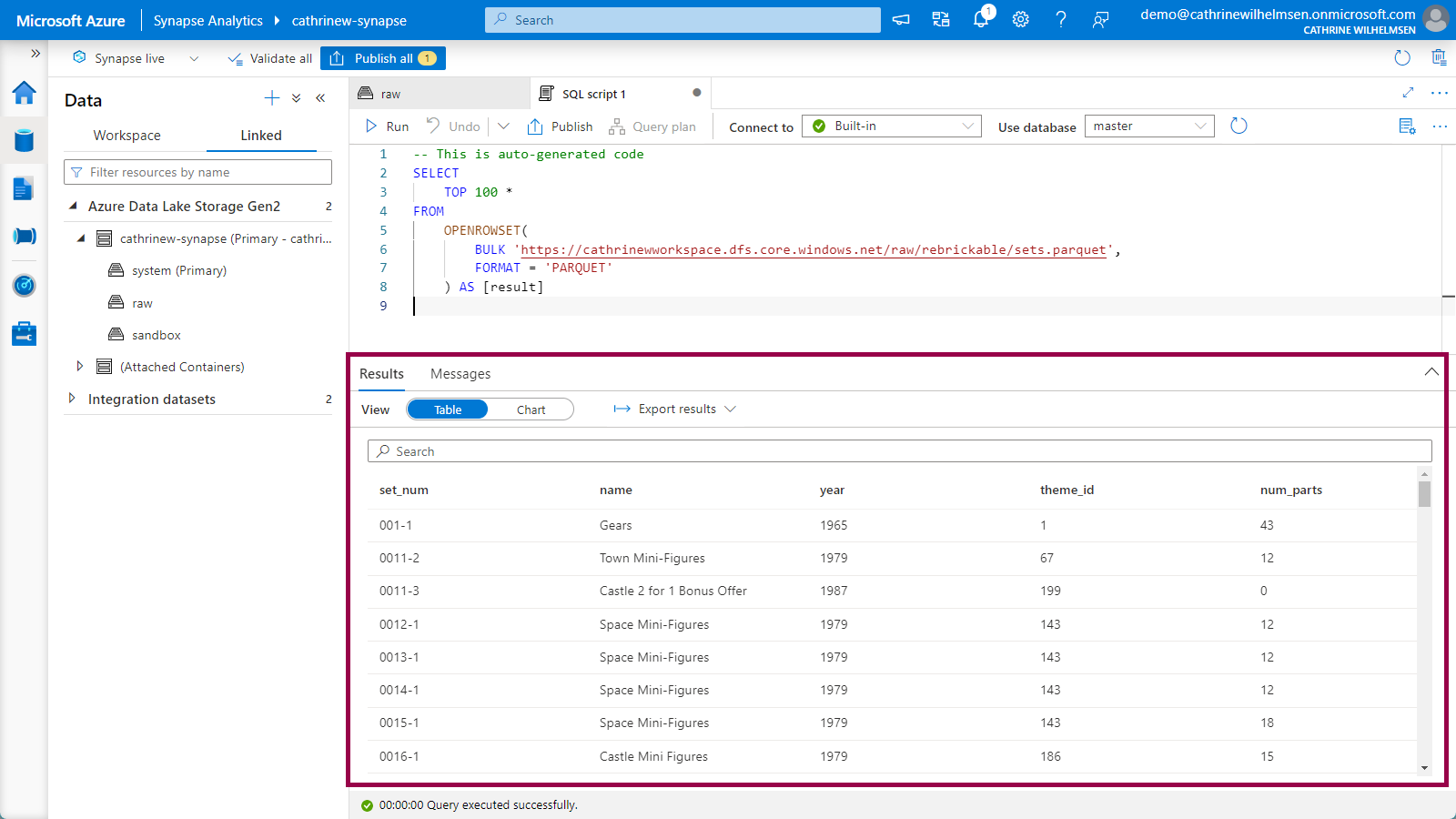 In this post, we walked through one of my favorite demos: ingesting and exploring LEGO datasets. It really only takes minutes to grab a compressed file from the web, decompress it, store it as a Parquet file in my data lake, and run SQL queries on it using Serverless SQL. I love it! 🤓