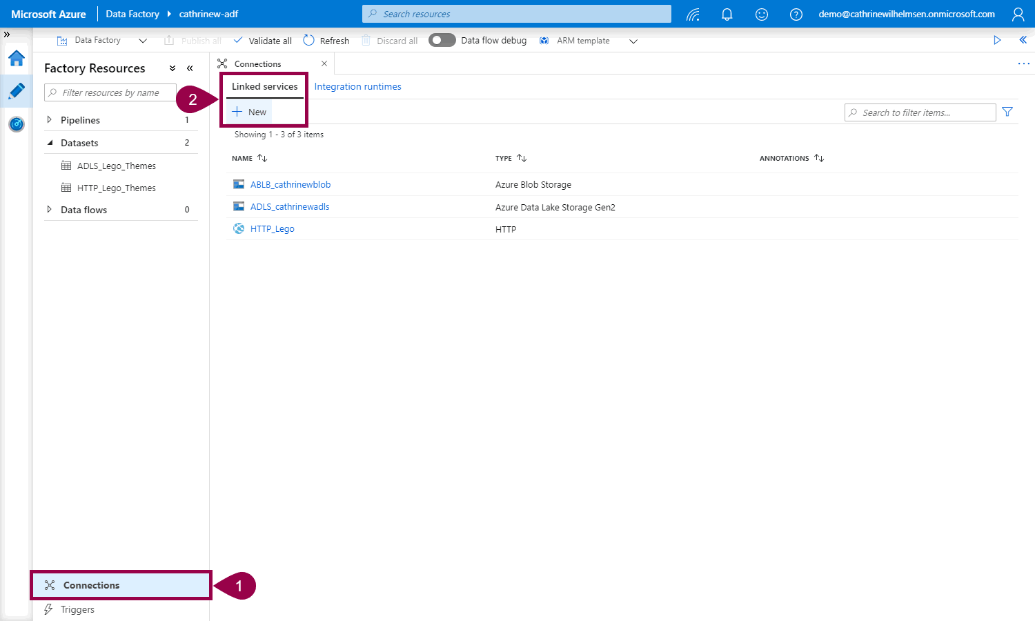 First, click Connections. Then, on the linked services tab, click New: