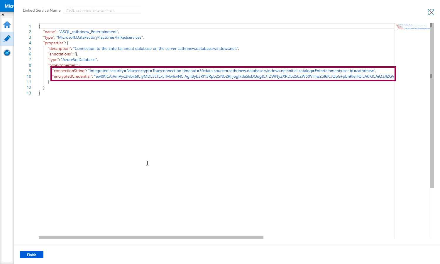 In the JSON code for the linked service, you can see that the connection string and user name is stored in plain text, while the password has been encrypted: