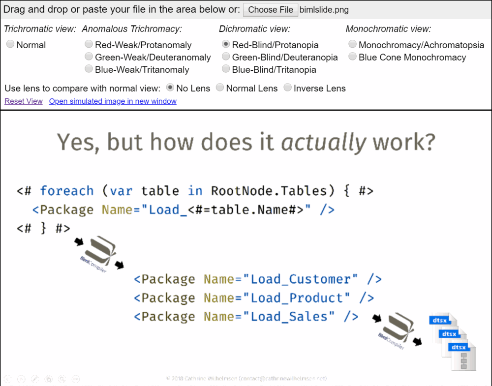 Coblis, the Color Blindness Simulator, allows you to view how someone with a color vision deficiency sees images. I use this when creating reports, documentation, and presentations. Does everything still make sense if the colors are changed or removed, or have I relied too much on my perception of color? With tools like Coblis, it’s easy to check these things before someone else points it out to you.