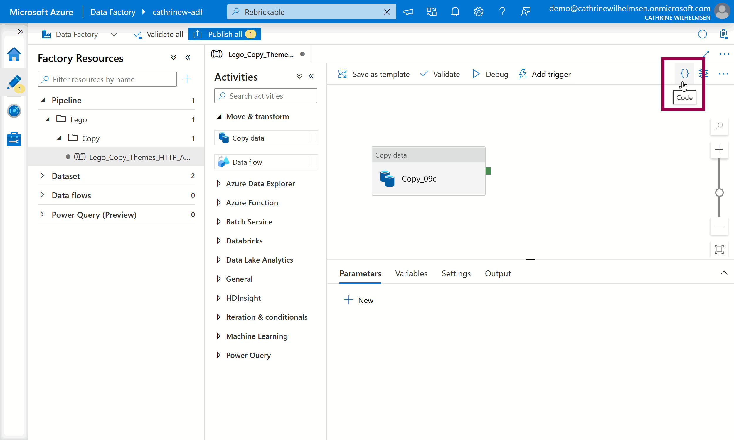 If you want to, you can work with everything in Azure Data Factory by writing JSON code. Click on Code in the top right corner: