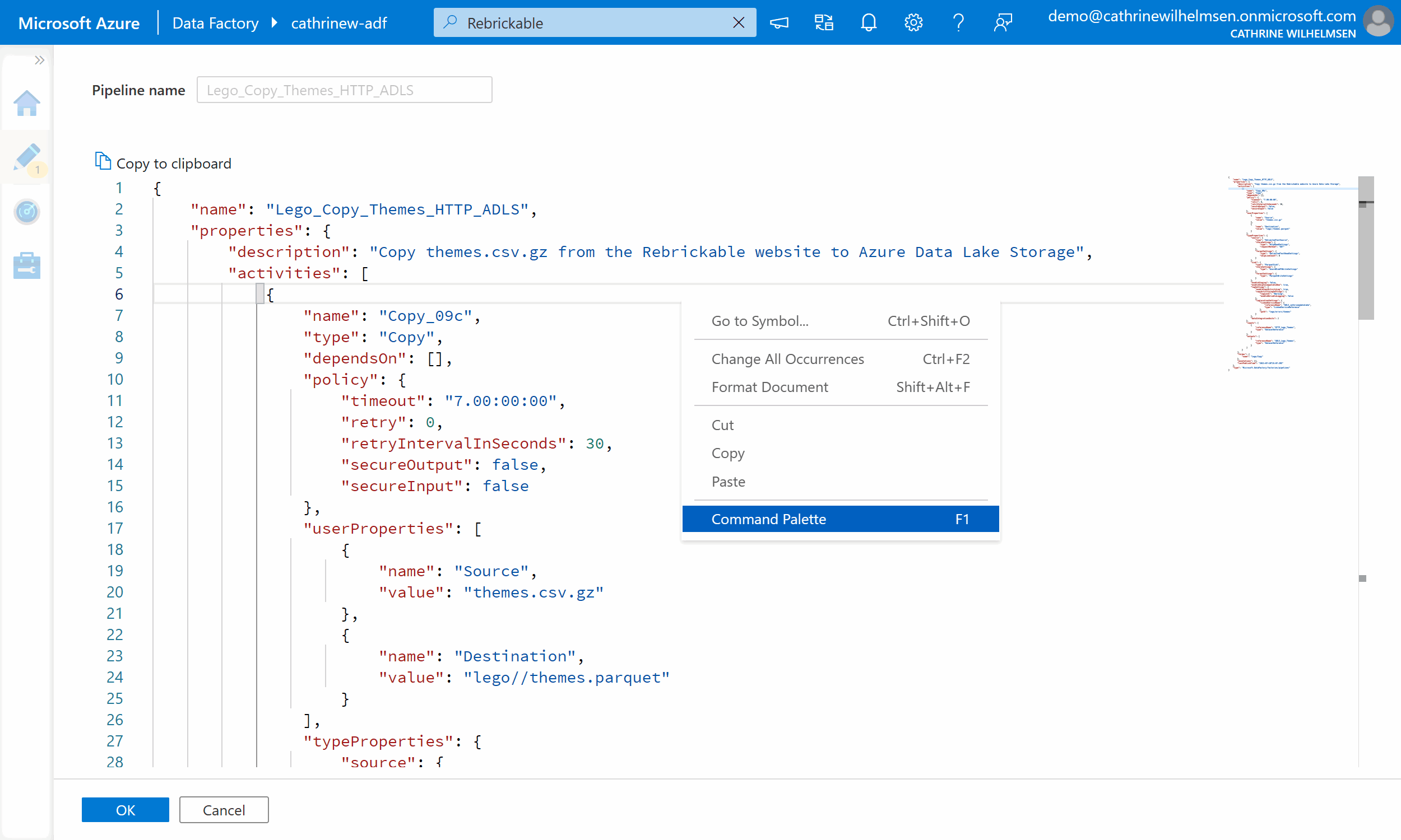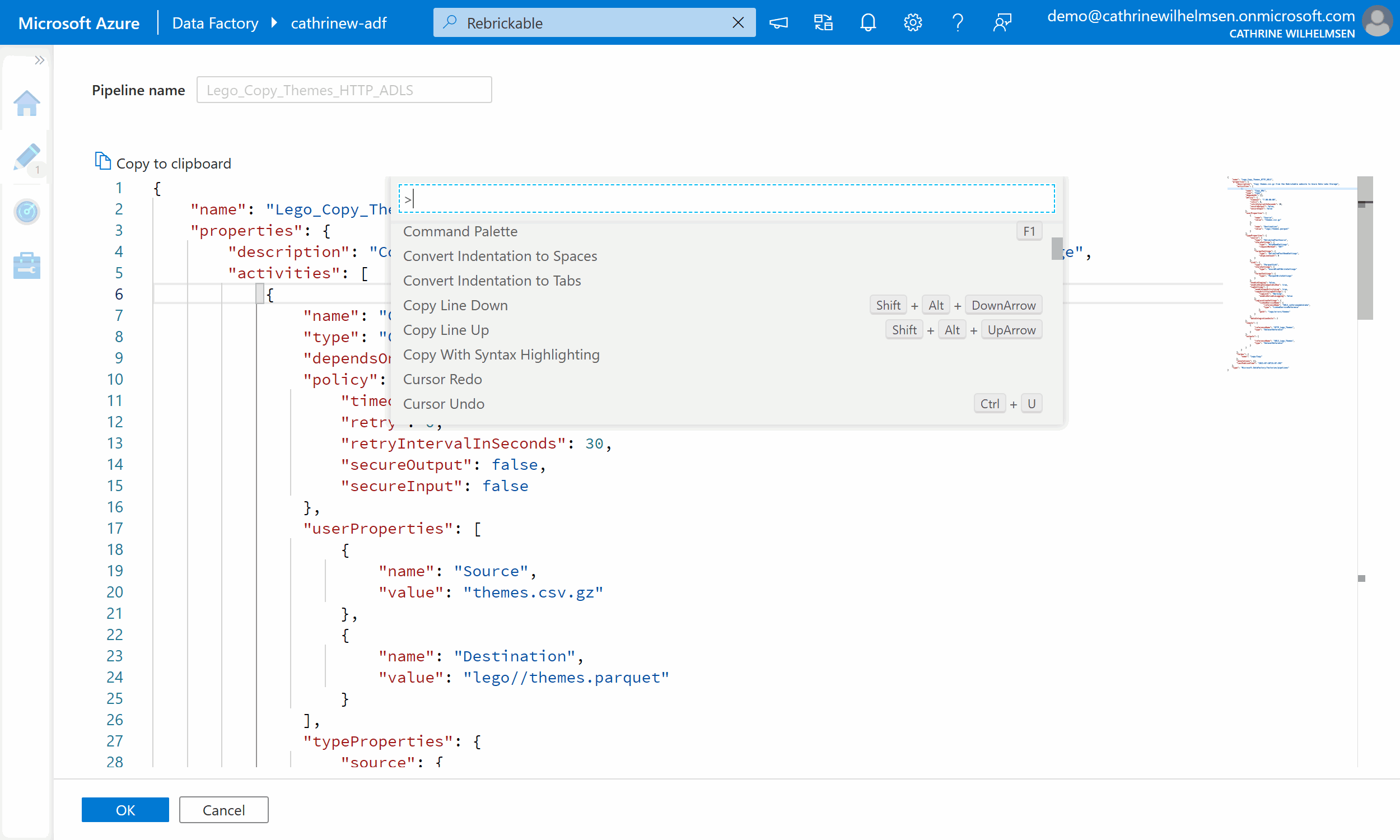I mostly use the graphical user interface when creating pipelines. However, when I want to rename something in multiple activities, I often find it easier to edit the JSON code. You can use Ctrl+F to find text and Ctrl+H to replace text. And! While this code view looks fairly simple, there is a full code editor behind the scenes. Whaaat! 🤯 You can discover this magic by right-clicking in the editor and choosing Command Palette, or by pressing F1: