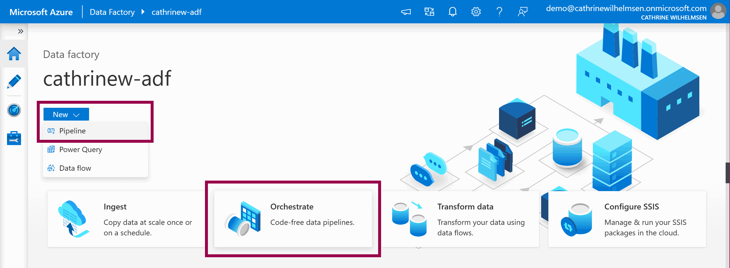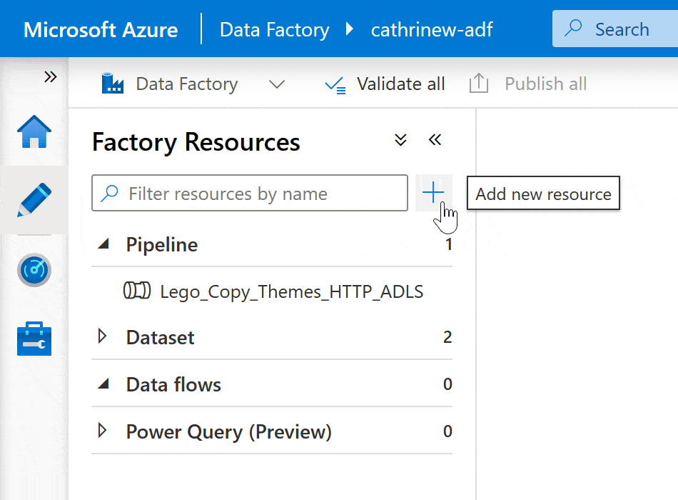 On the Author page, click + (Add new resource) under factory resources and then click Pipeline: