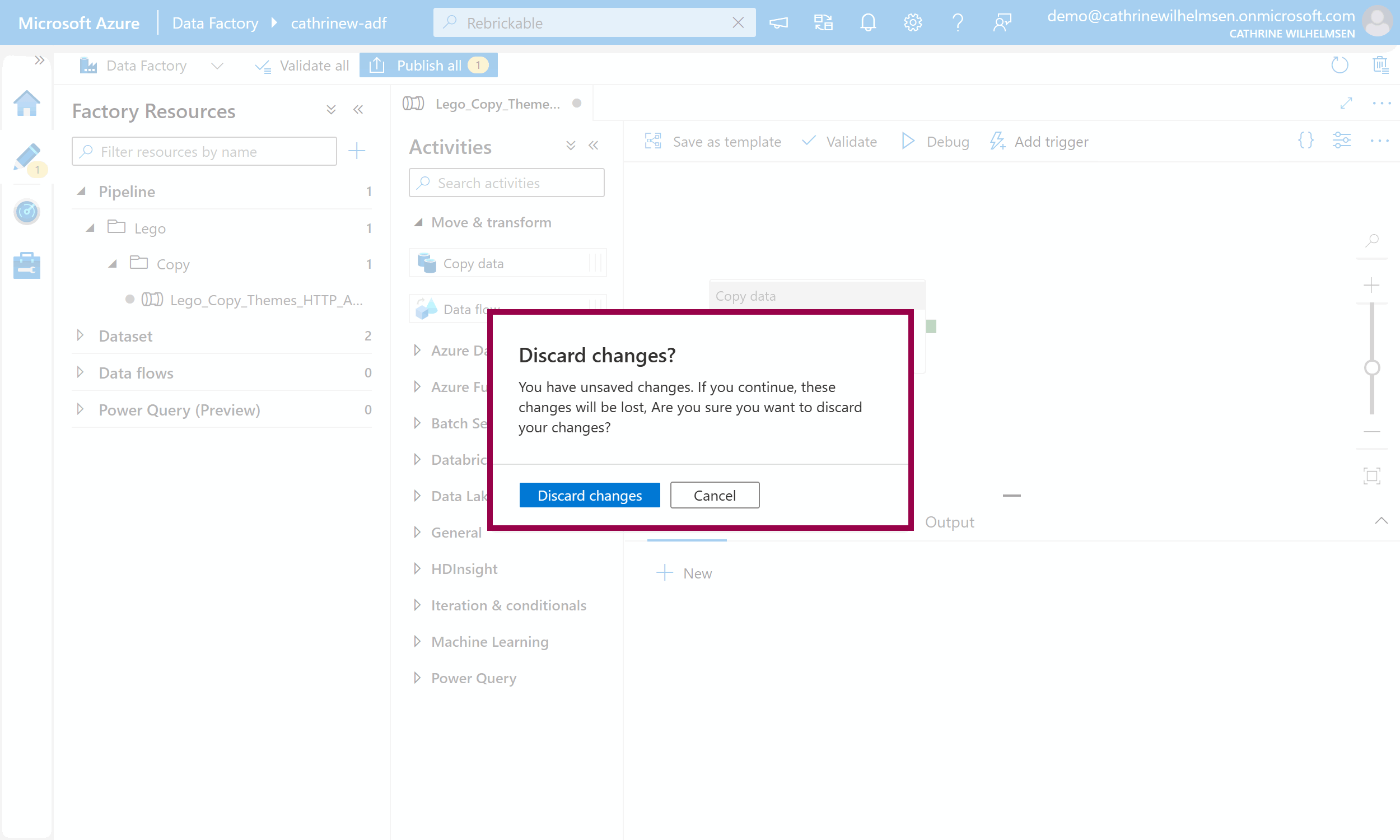 Confirm that you want to discard all the changes and go back to how your Azure Data Factory looked the last time you published: