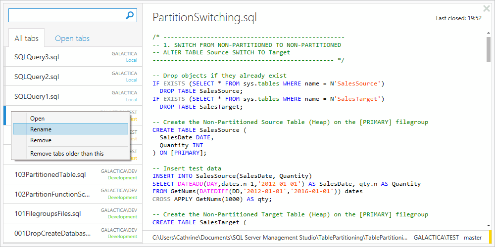 Hello, my name is Cathrine, and I am a tab hoarder 🤓 I always have lots of tabs open in SQL Server Management Studio (SSMS) connected to different environments. I have written about how Redgate SQL Prompt Tab Coloring makes it easy to find the right tab(s) based on the tab color, but that is not the only tab feature that saves me a lot of time.